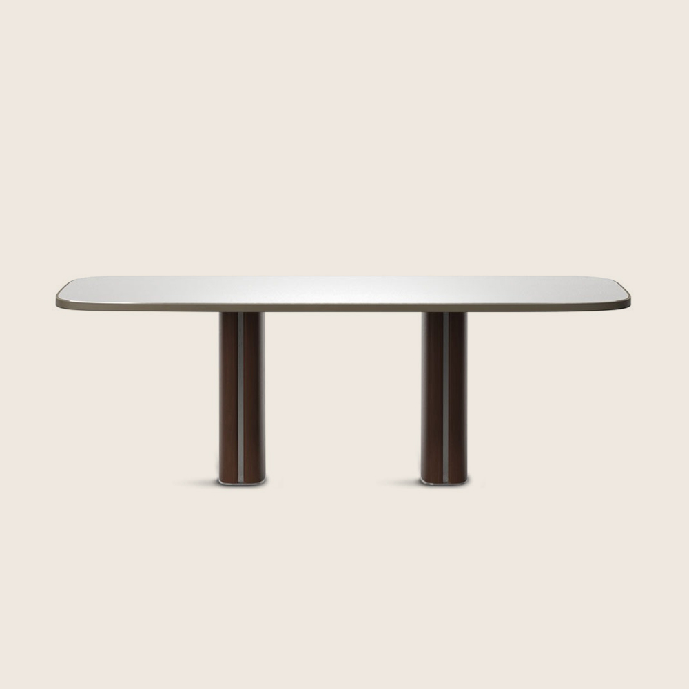 La particolare forma di Trafalgar si compone di un piano con angoli smussati e un robusto basamento in legno con inserti metallici, chiara ispirazione alla colonna dell’Ammiraglio Nelson a nell’omonima piazza di Londra.‎ Il tavolo è disponibile in due dimensioni diverse, e il top può essere realizzato in legno, marmo, Fenix o vetro retroverniciato.‎ Trafalgar appartiene alla collezione Plaza, un progetto che racconta un viaggio metaforico tra le capitali europee interpretandone le piazze urbane più iconiche, e si compone di tavoli, sedute, cabinet, desk e consolle, progettati non solo per la dimensione domestica più intima, ma anche per gli spazi dinamici dell’accoglienza.‎