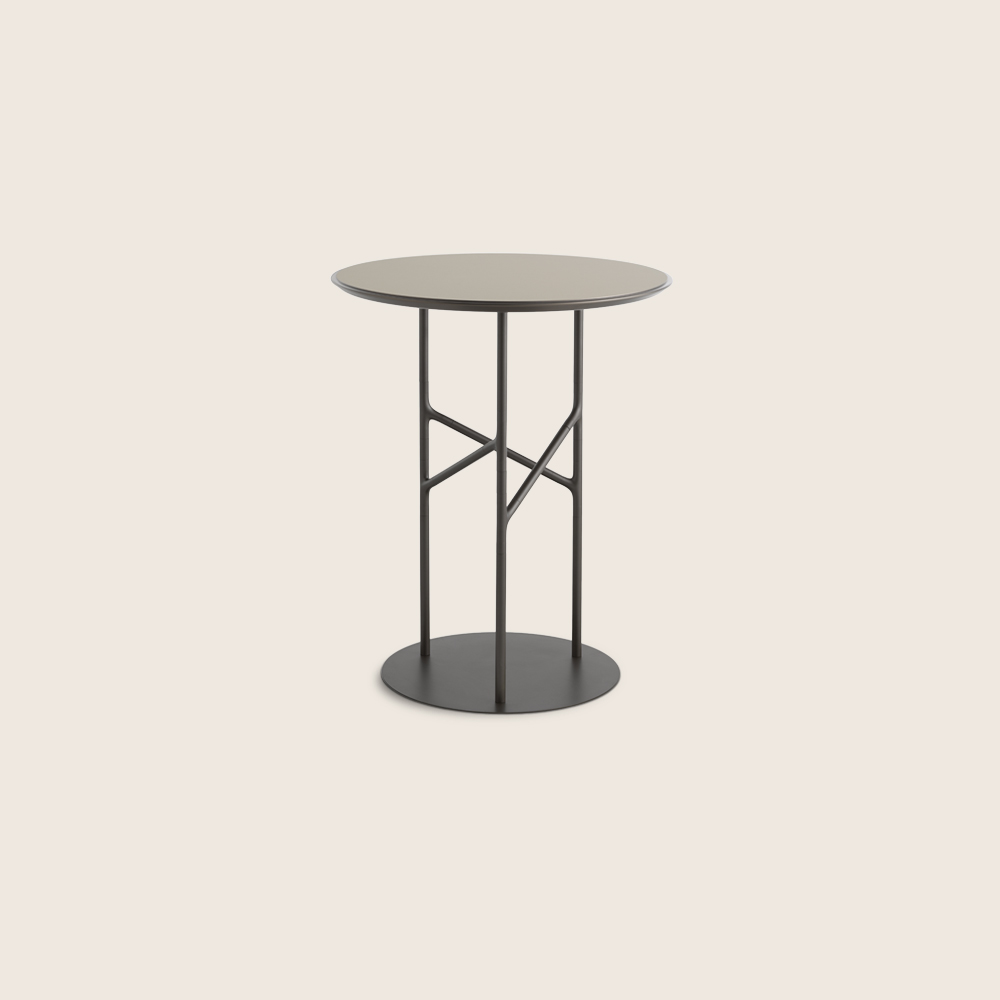 Alexander Bar Table traduce l’eleganza strutturale della collezione Alexander in un elemento pensato per il mondo dell’hospitality e del contract design. La base metallica, definita da un raffinato intreccio di elementi collegati da giunti a Y, garantisce solidità e presenza scultorea, mentre il piano rotondo in Fenix conferisce luminosità e modernità all’insieme.