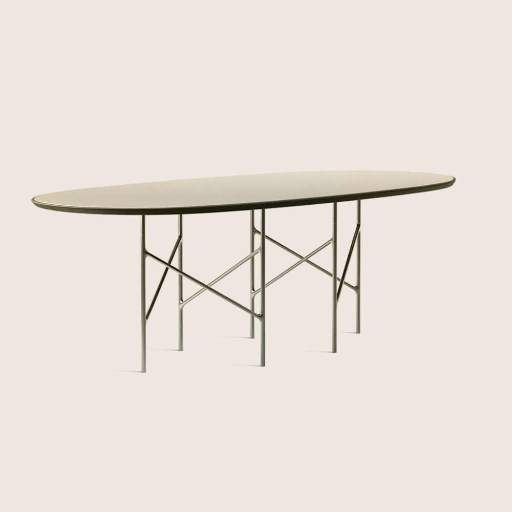 Nella versione ovale, Alexander esprime un’eleganza fluida e conviviale. La base in metallo, composta da gambe sottili collegate da giunti a Y, conferisce dinamismo e stabilità, mentre il piano — disponibile in marmo, Fenix o vetro retroverniciato — introduce una dimensione più morbida e accogliente alla geometria del tavolo.