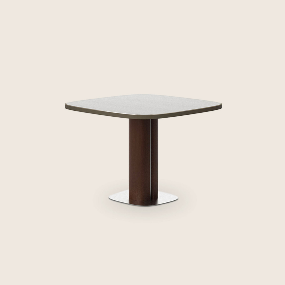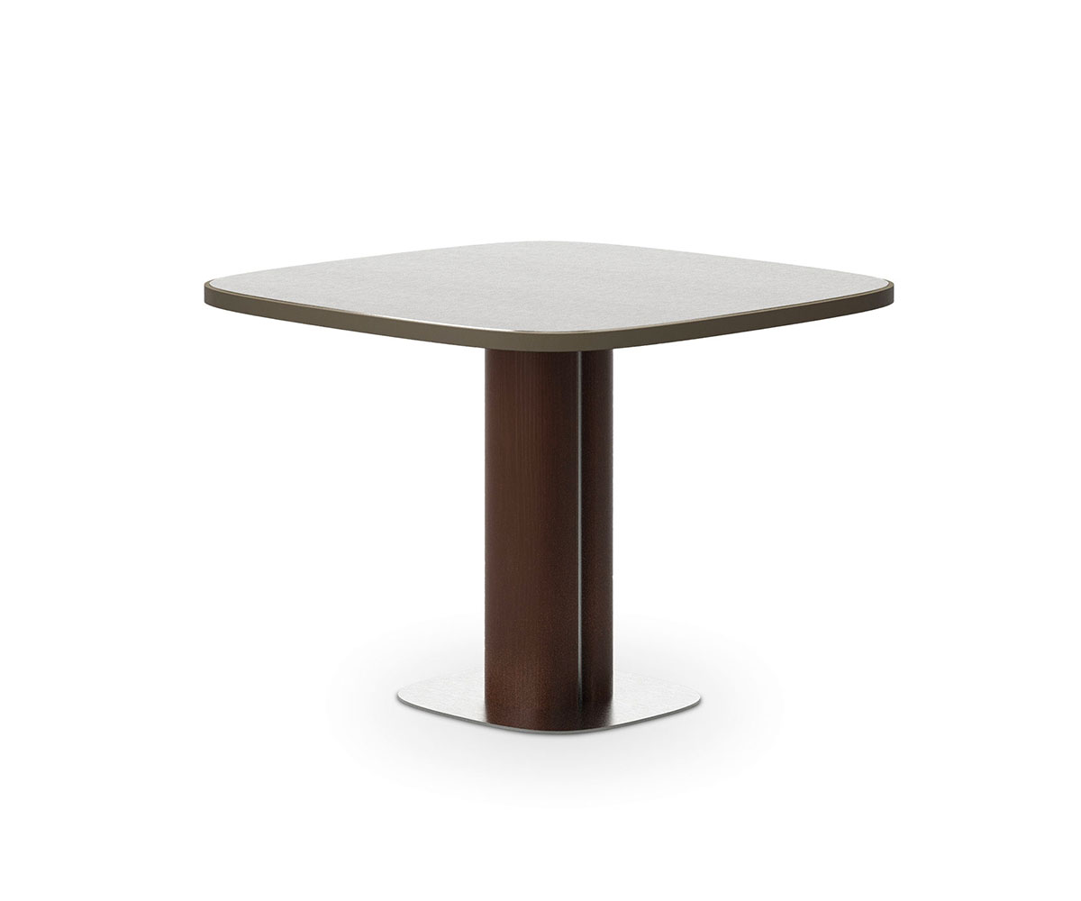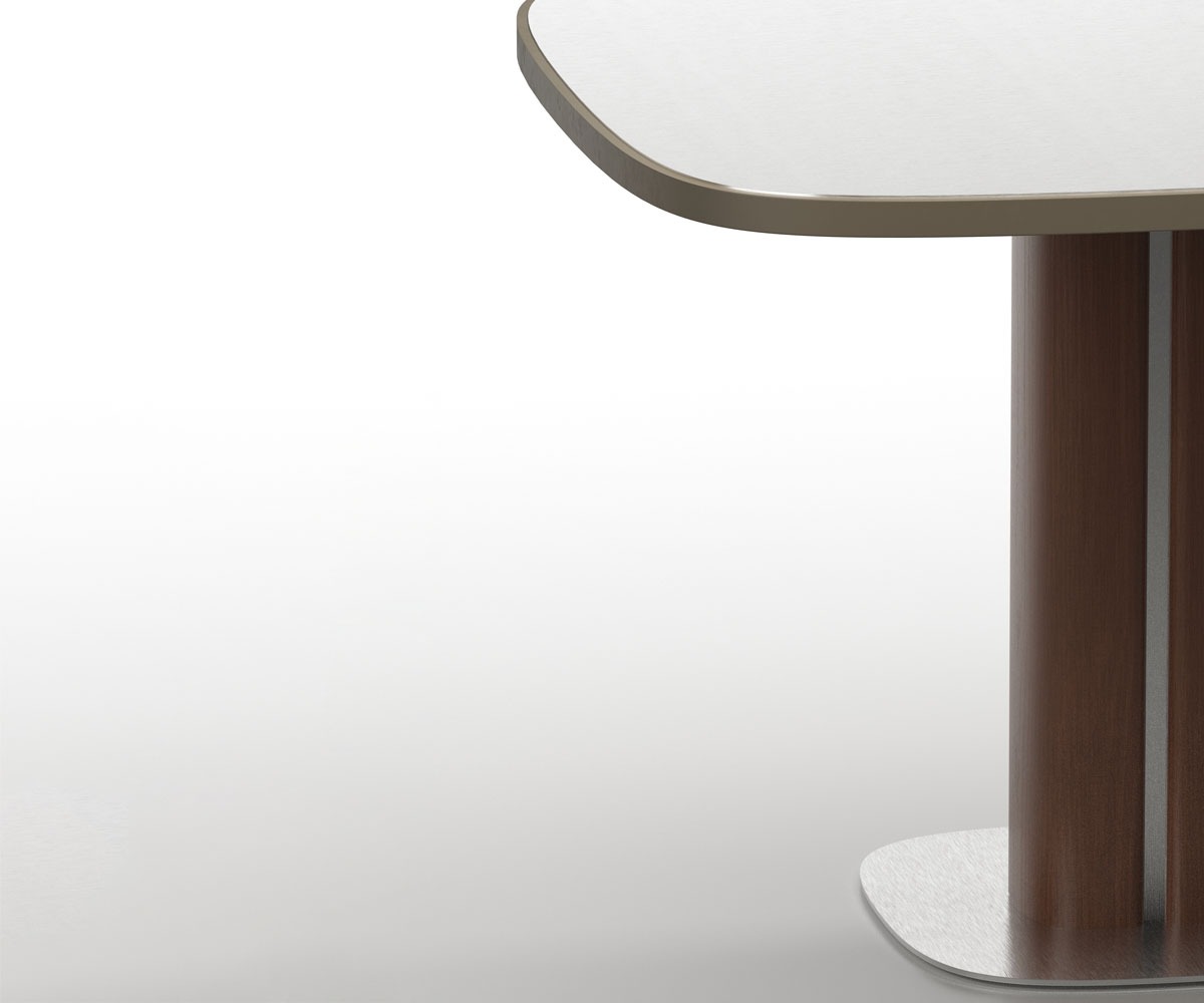 La particolare forma di Trafalgar si compone di un piano con angoli smussati e un robusto basamento in legno con inserti metallici, chiara ispirazione alla colonna dell’Ammiraglio Nelson a nell’omonima piazza di Londra. Il tavolo è disponibile in due dimensioni diverse, e il top può essere realizzato in legno, marmo, Fenix o vetro retroverniciato. Trafalgar appartiene alla collezione Plaza, un progetto che racconta un viaggio metaforico tra le capitali europee interpretandone le piazze urbane più iconiche, e si compone di tavoli, sedute, cabinet, desk e consolle, progettati non solo per la dimensione domestica più intima, ma anche per gli spazi dinamici dell’accoglienza.