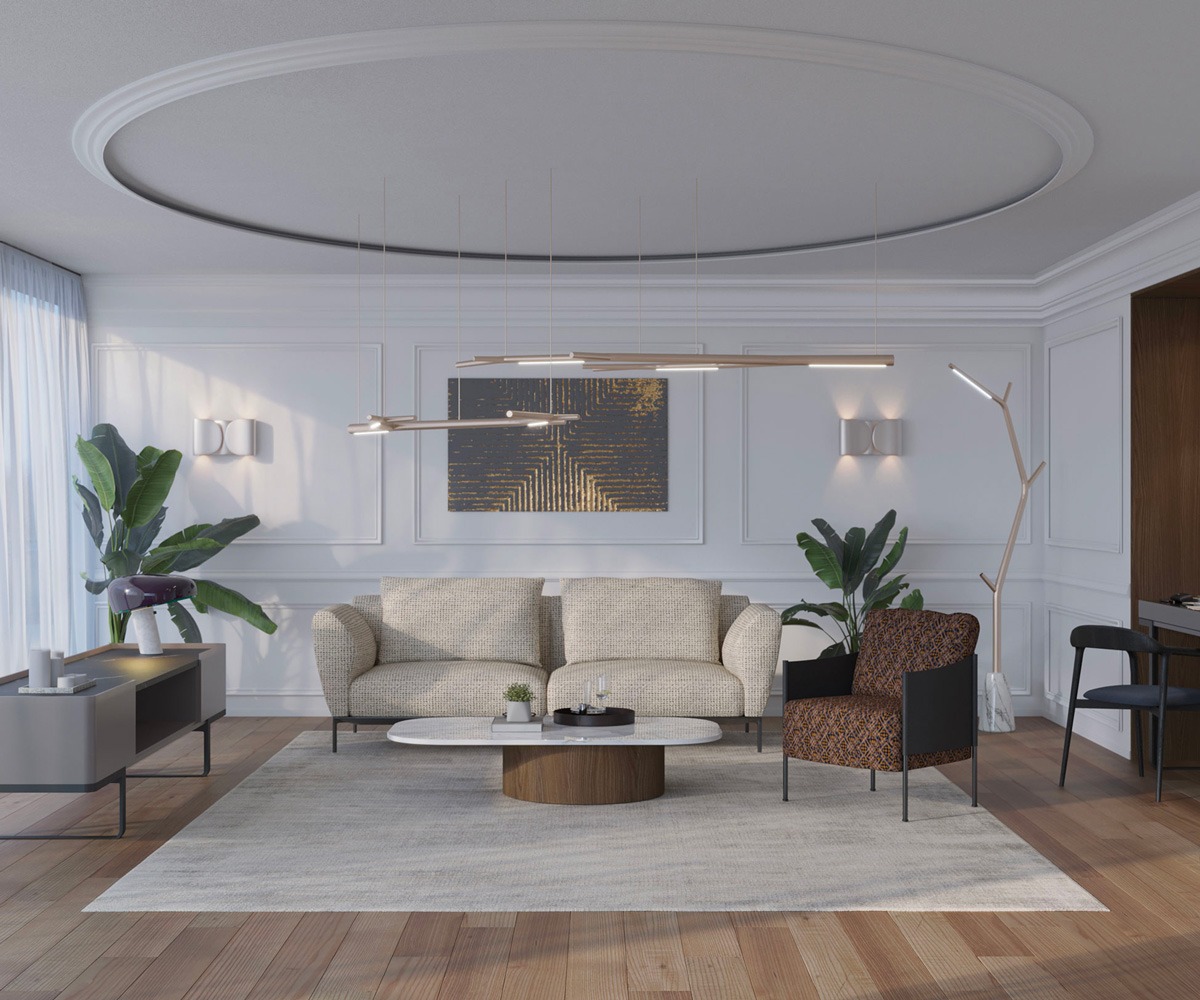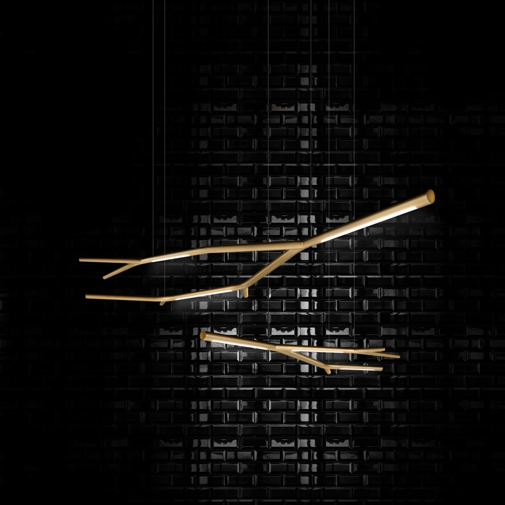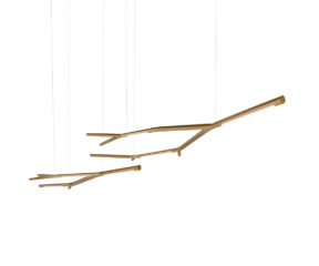 Aira è una sospensione scultorea che trasforma la luce in un segno poetico. Composta da due elementi di dimensioni differenti, presenta una struttura in ottone verniciata oro che evoca la naturale eleganza di un ramo d’albero sospeso nello spazio. L’effetto è di straordinaria leggerezza: un equilibrio visivo tra forma organica e precisione costruttiva, dove ogni linea diventa gesto luminoso.