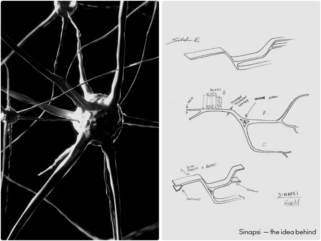 Le connessioni tra le sinapsi del cervello umano sono state la fonte di ispirazione per l’artista cileno Sebastian Errazuriz quando ha disegnato uno dei prodotti più longevi e più esclusivi di Horm: la mensola “Sinapsi”. La mensola ha un unica forma, ma affiancandone, ruotandone e specchiandone più di una è possibile realizzare infinite composizioni creando delle ampie ed eclettiche librerie a parete. E come se Sinapsi permettesse di “disegnare sulle pareti” usando un elemento d’arredo piuttosto che una matita.