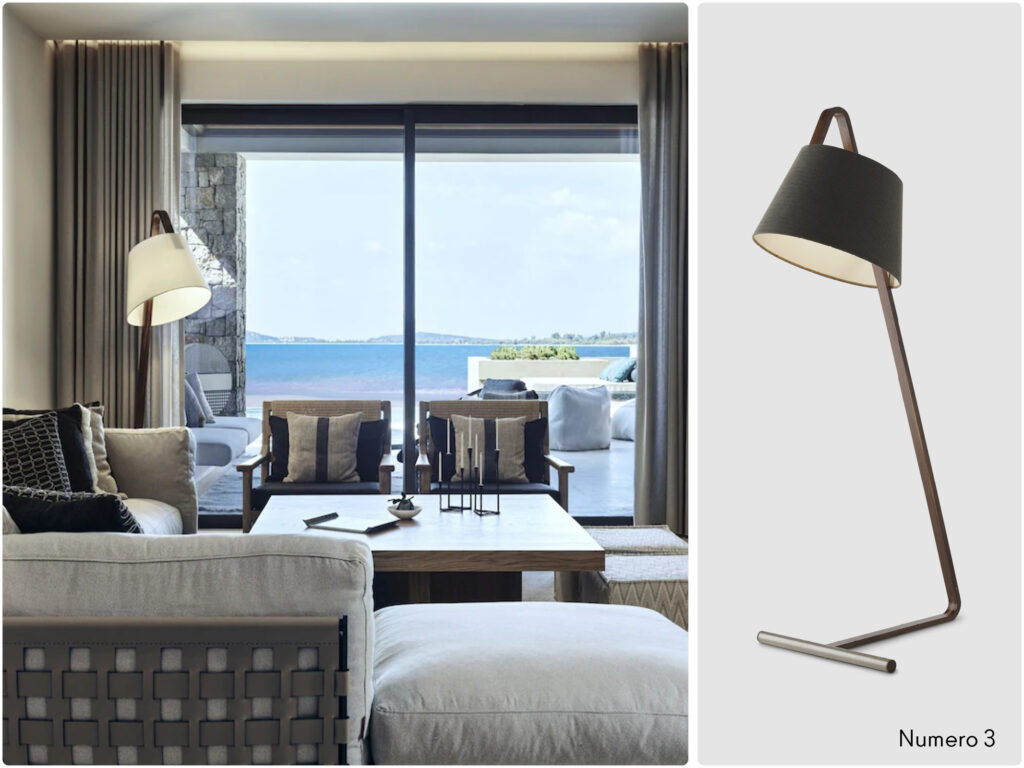 • la lampada da terra Numero 3 che con la sua luce calda e avvolgente e l’amplissima possibilità di personalizzazione del paralume, riesce a ricreare un’atmosfere magica nei salottini interni delle suites