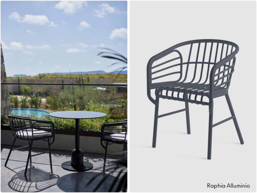 • le sedute Raphia alluminio, perfetto equilibrio tra funzionalità moderna e stile classico che consentono agli ospiti di rilassarsi e godersi appieno degli spazi esterni.