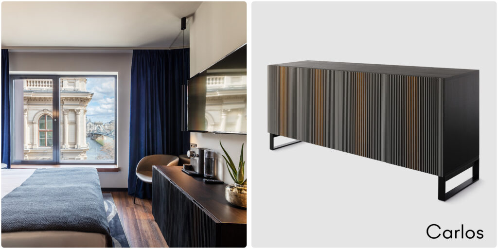 Ecco quindi come si inserisce la madia Carlos che per l’occasione è stata ridefinita nei materiali e nei colori: le caratteristiche stecche bianche che solcano ogni anta del mobile hanno lasciato il posto ad una versione “dark” delle stesse e anche il legno della struttura, su espressa richiesta del committente, è stato ripensato per offrire una durevolezza tipicamente contract.