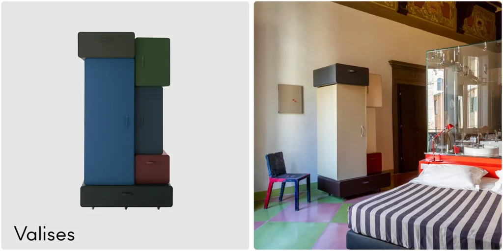 Gli anticonvenzionali armadi Valises di Maarten de Ceulaer arredano le camere, creando un contrasto affascinante tra la struttura storica dell’hotel e le soluzioni di design più innovative.