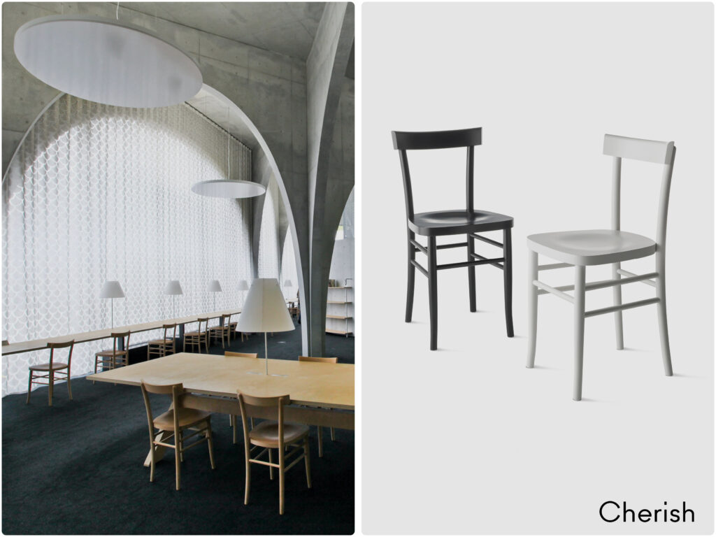 Le Cherish, che nell’immaginario comune sono le classiche sedute per un ristorante o per la cucina di casa, hanno saputo integrarsi perfettamente, nella versione in faggio naturale massello, a questa culla del sapere moderno.