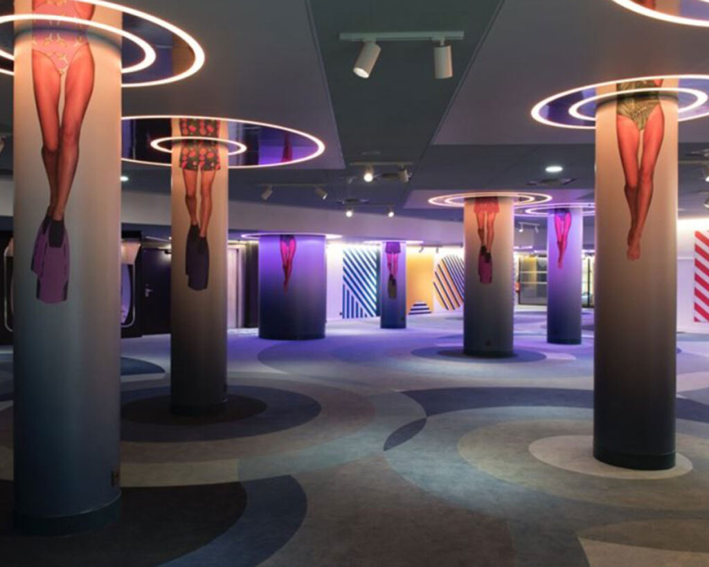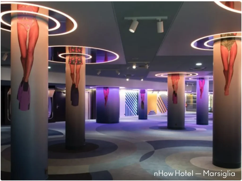 L’articolo prosegue narrando la genesi del Nhow Hotel di Marsiglia in cui, proprio grazie all’uso del colore e a soluzioni fuori dagli schemi, lo studio Sapey è riuscito a trasformare una giungla di pilastri e un tunnel lunghissimo (buio e con i soffitti bassi) in un caleidoscopio di piani e colori, tagliando e frantumando lo spazio, per creare nuove dinamiche costruttive.
