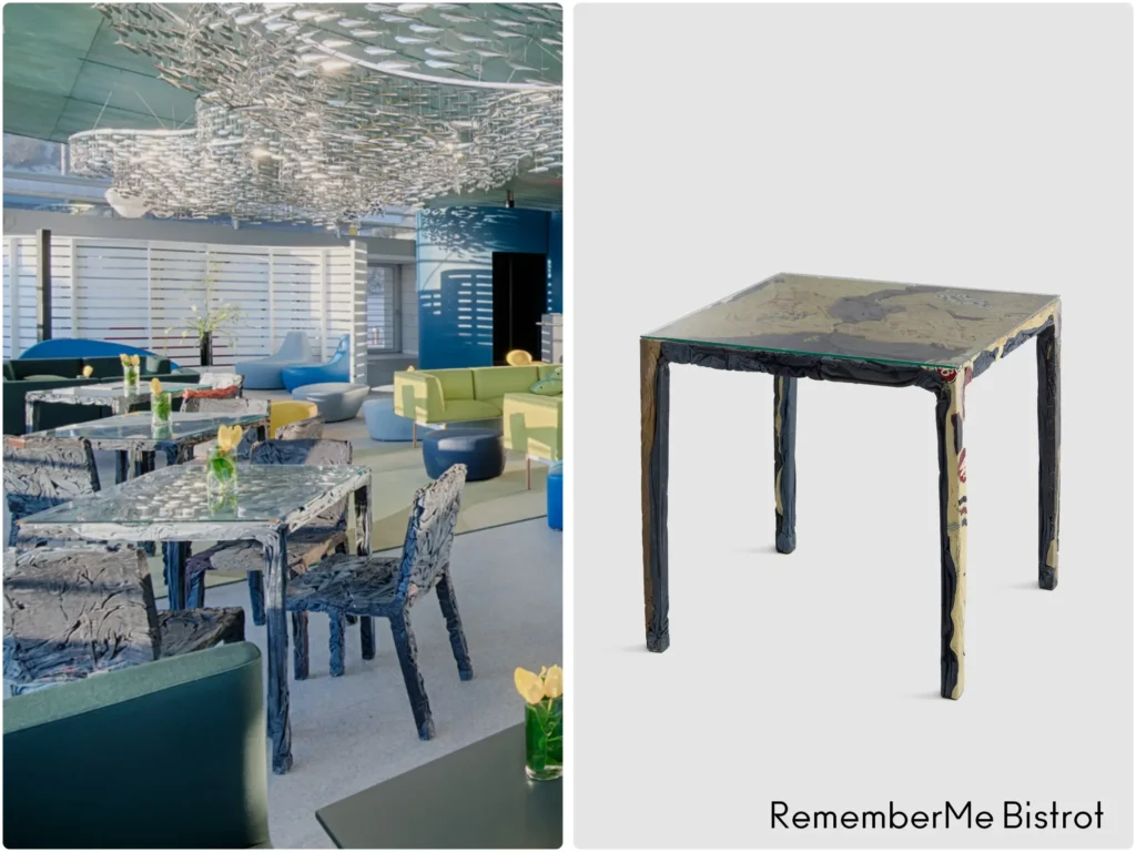 In questa “architettura visionaria e fuori dagli schemi” hanno trovato la perfetta collocazione i pouff Pollon, ma soprattutto le sedie e i tavolini bistrot RememberMe di Casamania: un originale progetto firmato Tobias Juretzek per Casamania che si fa portavoce dei temi della sostenibilità e riciclo uniti alla volontà di dare una nuova vita a oggetti che sono inconsapevolmente portatori di ricordi e memorie. Le sedute e i tavolini vengono infatti realizzati interamente con vecchi jeans e t-shirt (eventualmente di proprietà del cliente) assemblati e resi rigidi tramite un originale processo realizzativo.
