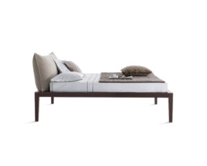 Moheli è un letto con gambe e giroletto in legno di rovere, tinto moca o laccato bianco a poro aperto ed è disponibile nella versione bassa (h40cm) o alta (h50 cm). La testiera è imbottita e rivestita in tessuto, pelle o ecopelle. Il rivestimento è sfoderabile e lavabile e può essere realizzato scegliendo tra i tessuti in campionario. Materasso venduto a parte.