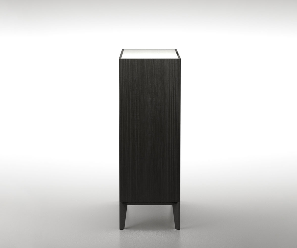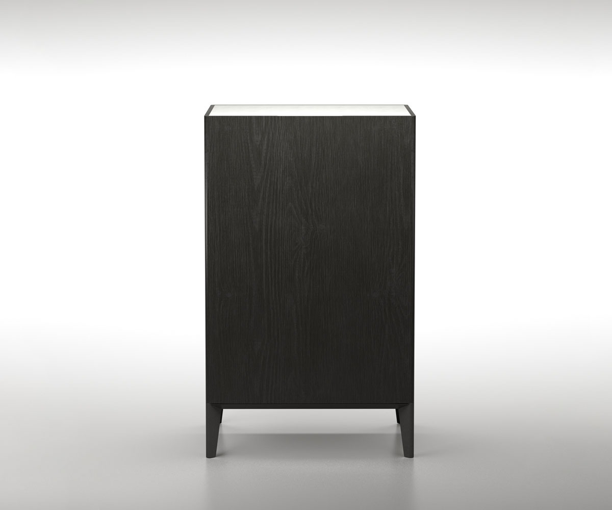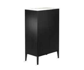 Il Dam cabinet di forma rettangolare come la famosa piazza di Amsterdam, presenta delle ante in legno dalle varie finiture, come ad esempio il frassino nero, dall’apertura a libro, che possono essere separate da un cassetto centrale nella versione Low che nasconde un ulteriore elemento contenitore. La parte metallica segue tutto il basso perimetro del cabinet e termina in quattro piedi agli angoli esterni. La collezione Dam cabinet si arricchisce di ulteriori elementi dalle diverse dimensioni, come il mobile buffet ed il cabinet bar.