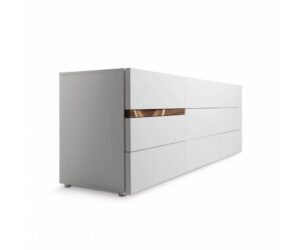 Una madia semplice e raffinata in cui il segno caratteristico di Horm è immediatamente riconoscibile: un inserto di una porzione della celeberrima panca Ripples di Toyo Ito, che caratterizza l’aspetto estetico mutando l’approccio minimale del disegno complessivo. L’elemento non è altro che il frontale di un sottile cassetto portagioie.
