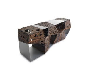 Una vera e propria opera d’arte composta da una struttura e da cinque contenitori con anta realizzati in fogli lignei dallo spessore di due millimetri e piegati come degli origami, grazie ad un complesso processo tecnologico brevettato. Riddled Buffet ha grande fascino ed eleganza grazie ai volumi scultorei, già caratterizzati dalle texture traforate tipiche di molte celebri opere di Steven Holl. Il risultato è un contenitore sfaccettato, leggero e lucente come un diamante, ma di legno, secondo lo stile Horm.