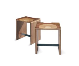Sgabello realizzato con uno speciale ed esclusivo multistrato di cinque differenti essenze di legno (noce canaletto, mogano, ciliegio, rovere e frassino). Poggiapiedi in alluminio nodizzato trafilato.